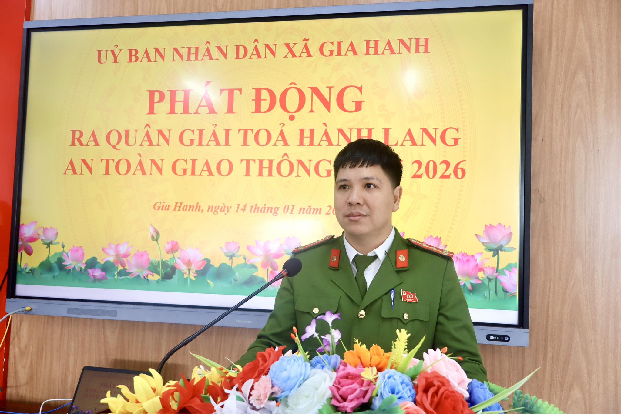 Đại úy Nguyễn Anh Đức - Phó Trưởng Công an xã Gia Hanh thông qua kế hoạch đợt cao điểm tuyên truyền, giải tỏa hành lang ATGT.