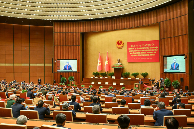 Toàn cảnh Hội nghị tại điểm cầu Trung ương ở Hội trường Diên Hồng; kết hợp trực tuyến đến 27.284 điểm cầu ở Trung ương, các tỉnh, thành phố, các xã, phường.