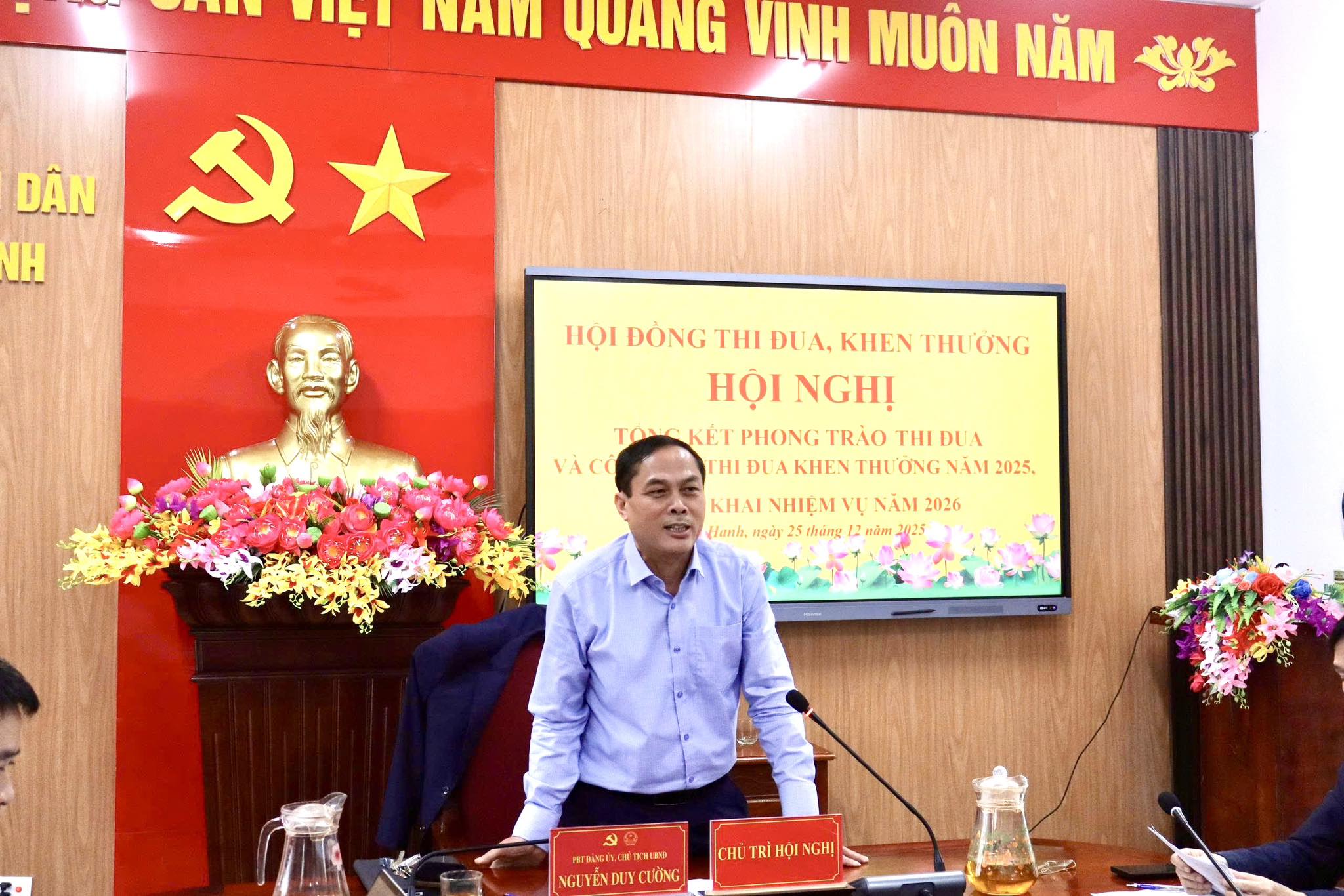 Phát biểu kết luận hội nghị, đồng chí Nguyễn Duy Cường đề nghị năm 2026, các cấp, các ngành tiếp tục đổi mới nội dung, hình thức thi đua theo hướng thiết thực, hiệu quả; gắn với cải cách hành chính, chuyển đổi số và xây dựng nông thôn mới nâng cao; chú trọng phát hiện, nhân rộng các điển hình tiên tiến, tạo động lực hoàn thành các nhiệm vụ chính trị của địa phương.