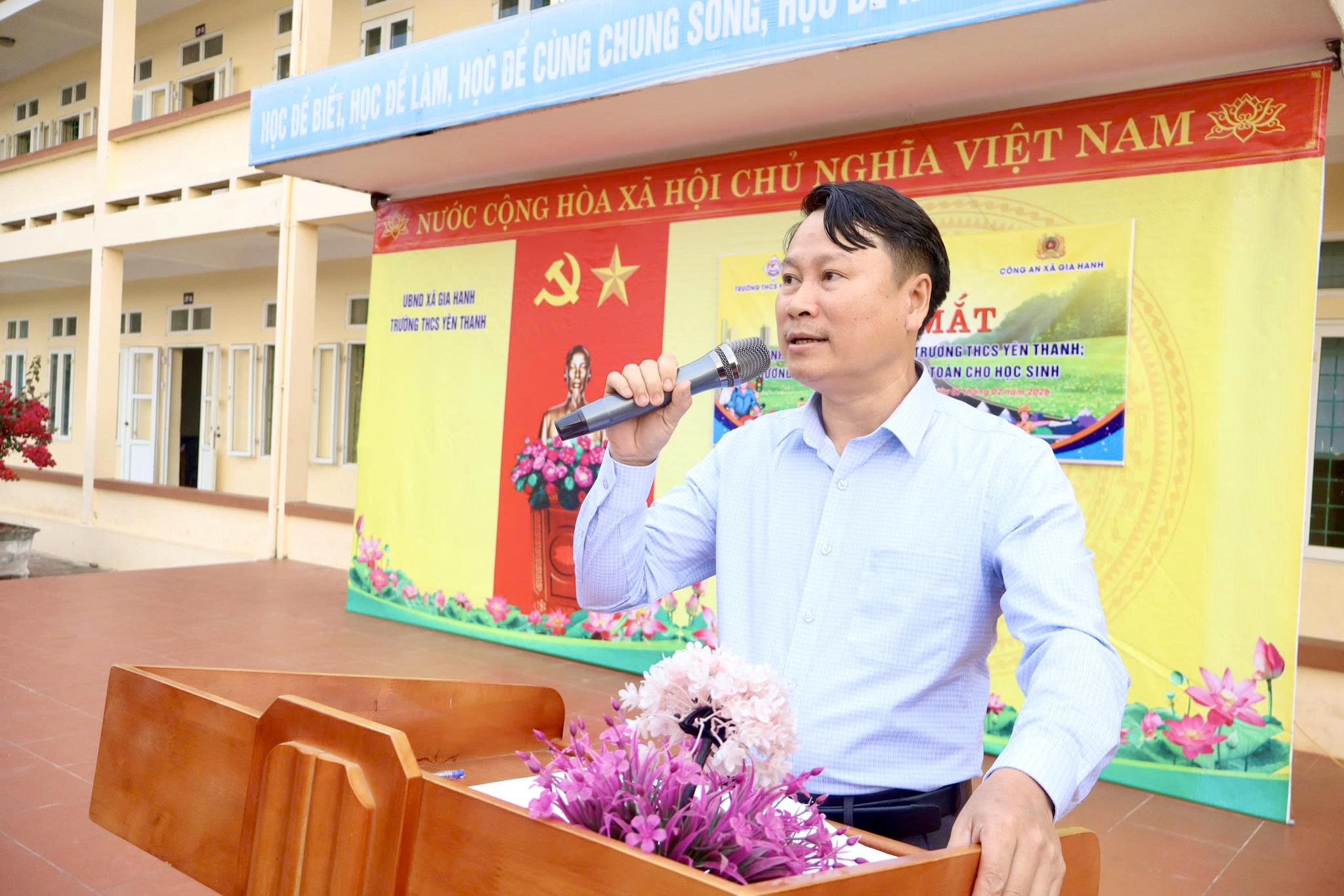 Thầy Nguyễn Quang Huy - Hiệu trưởng Trường THCS Yên Thanh phát biểu tại buổi lễ.