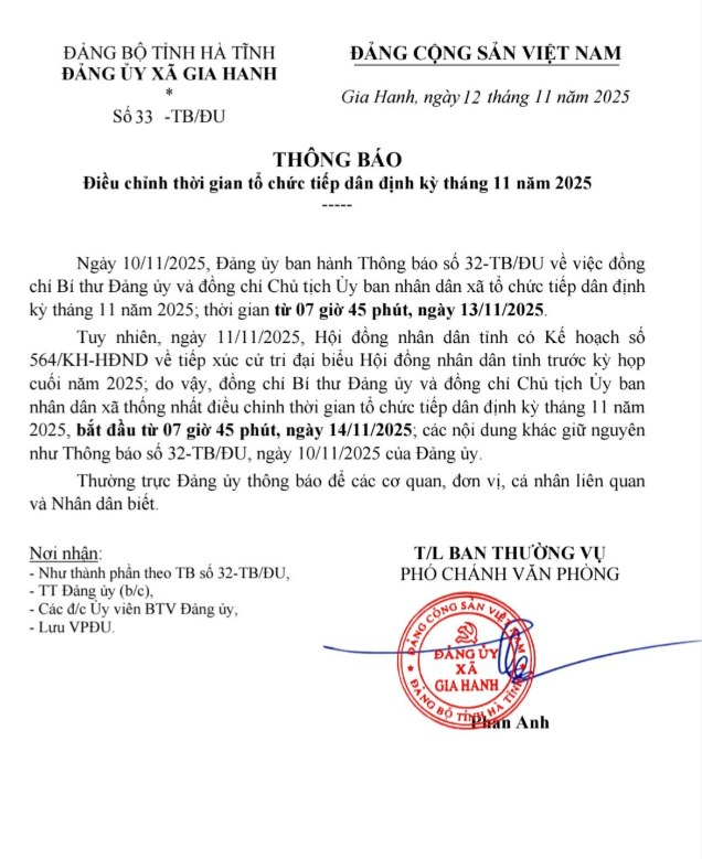 Ngày 10/11/2025, Đảng ủy ban hành Thông báo số 32-TB/ĐU về việc đồng chí Bí thư Đảng ủy và đồng chí Chủ tịch Ủy ban nhân dân xã tổ chức tiếp dân định kỳ tháng 11 năm 2025; thời gian từ 07 giờ 45 phút, ngày 13/11/2025. Tuy nhiên, ngày 11/11/2025, Hội đồng nhân dân tỉnh có Kế hoạch số 564/KH-HĐND về tiếp xúc cử tri đại biểu Hội đồng nhân dân tỉnh trước kỳ họp cuối năm 2025; do vậy, đồng chí Bí thư Đảng ủy và đồng chí Chủ tịch Ủy ban nhân dân xã thống nhất điều chỉnh thời gian tổ chức tiếp dân định kỳ tháng 11 năm 2025, bắt đầu từ 07 giờ 45 phút, ngày 14/11/2025; các nội dung khác giữ nguyên như Thông báo số 32-TB/ĐU, ngày 10/11/2025 của Đảng ủy.