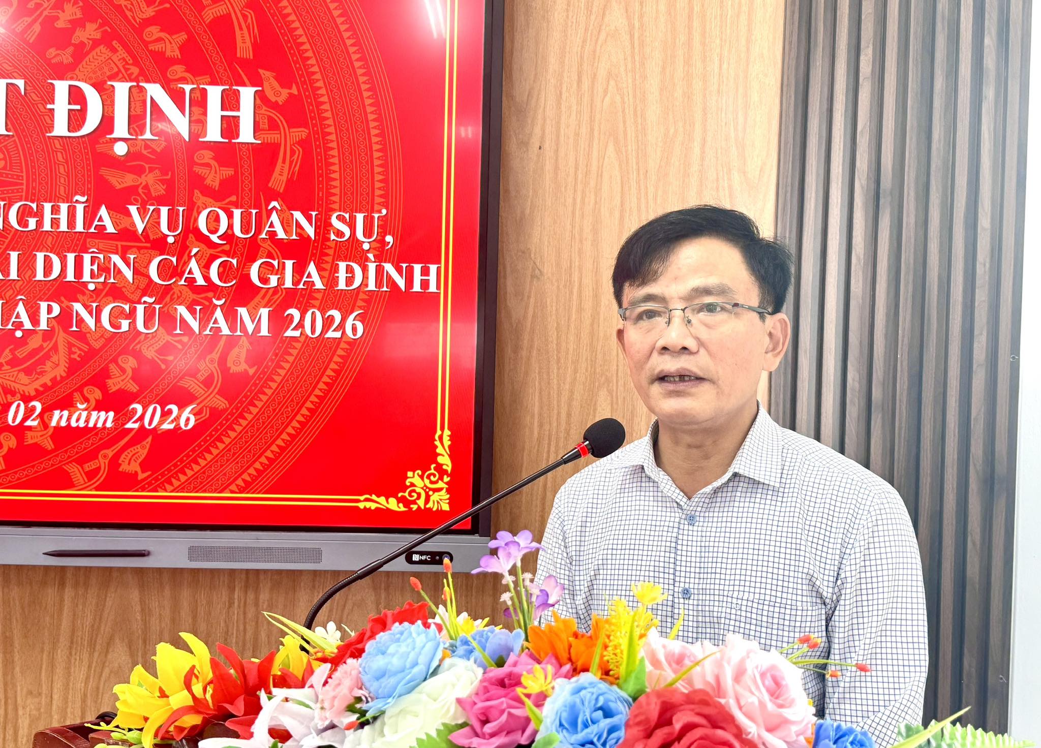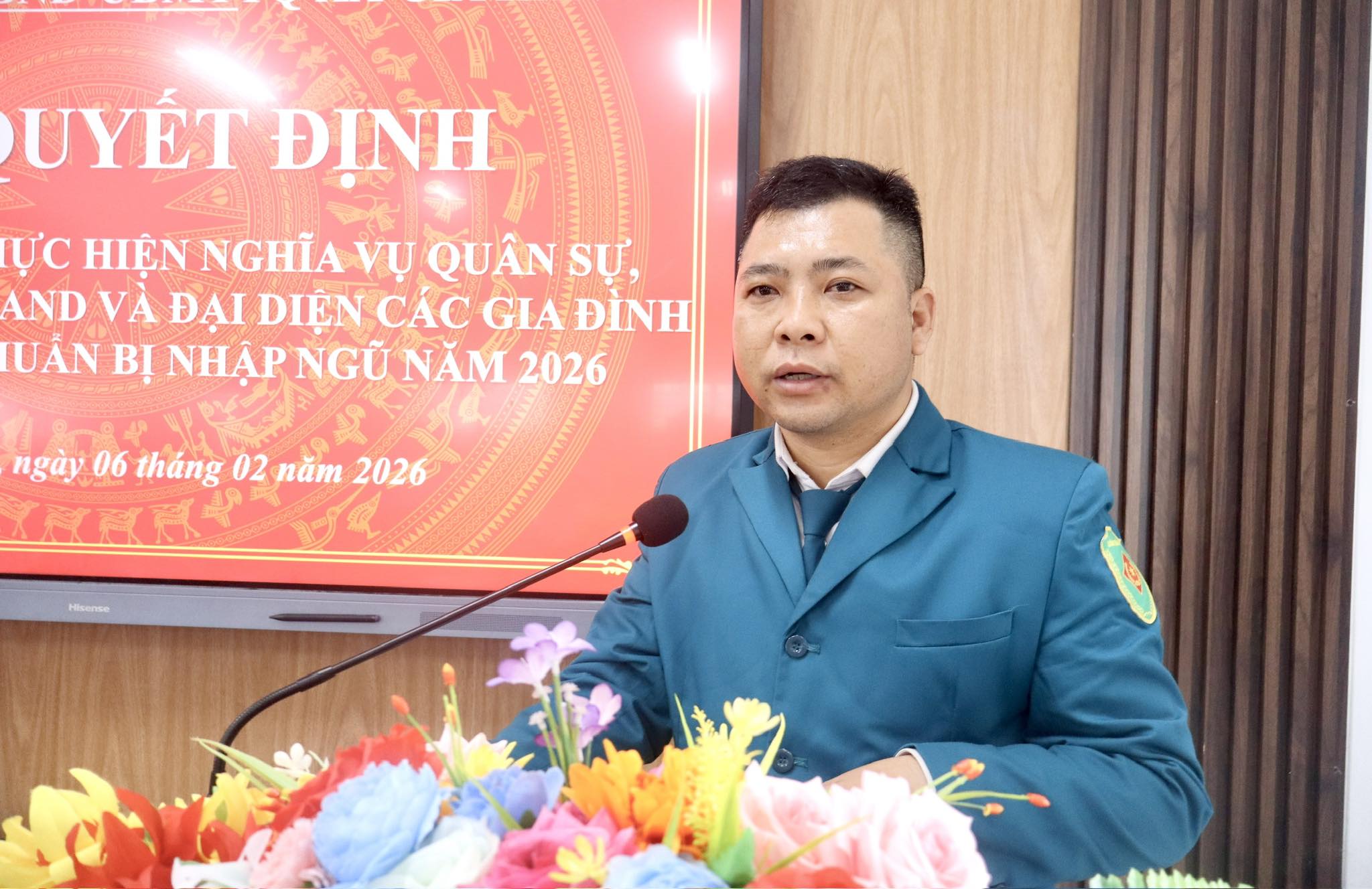 Phát biểu tại buổi gặp mặt, đồng chí Bùi Văn Sơn – Bí thư Đảng ủy, Chủ tịch HĐND xã động viên các gia đình và thanh niên chuẩn bị lên đường nhập ngũ năm 2026; mong muốn các tân binh phát huy truyền thống quê hương, nỗ lực khắc phục khó khăn, không ngừng tu dưỡng phẩm chất đạo đức, tích cực học tập, rèn luyện, hoàn thành tốt mọi nhiệm vụ được giao. Đồng chí cũng căn dặn các thanh niên giữ gìn sức khỏe, chuẩn bị tốt về mọi mặt, sẵn sàng lên đường thực hiện nghĩa vụ thiêng liêng đối với Tổ quốc.