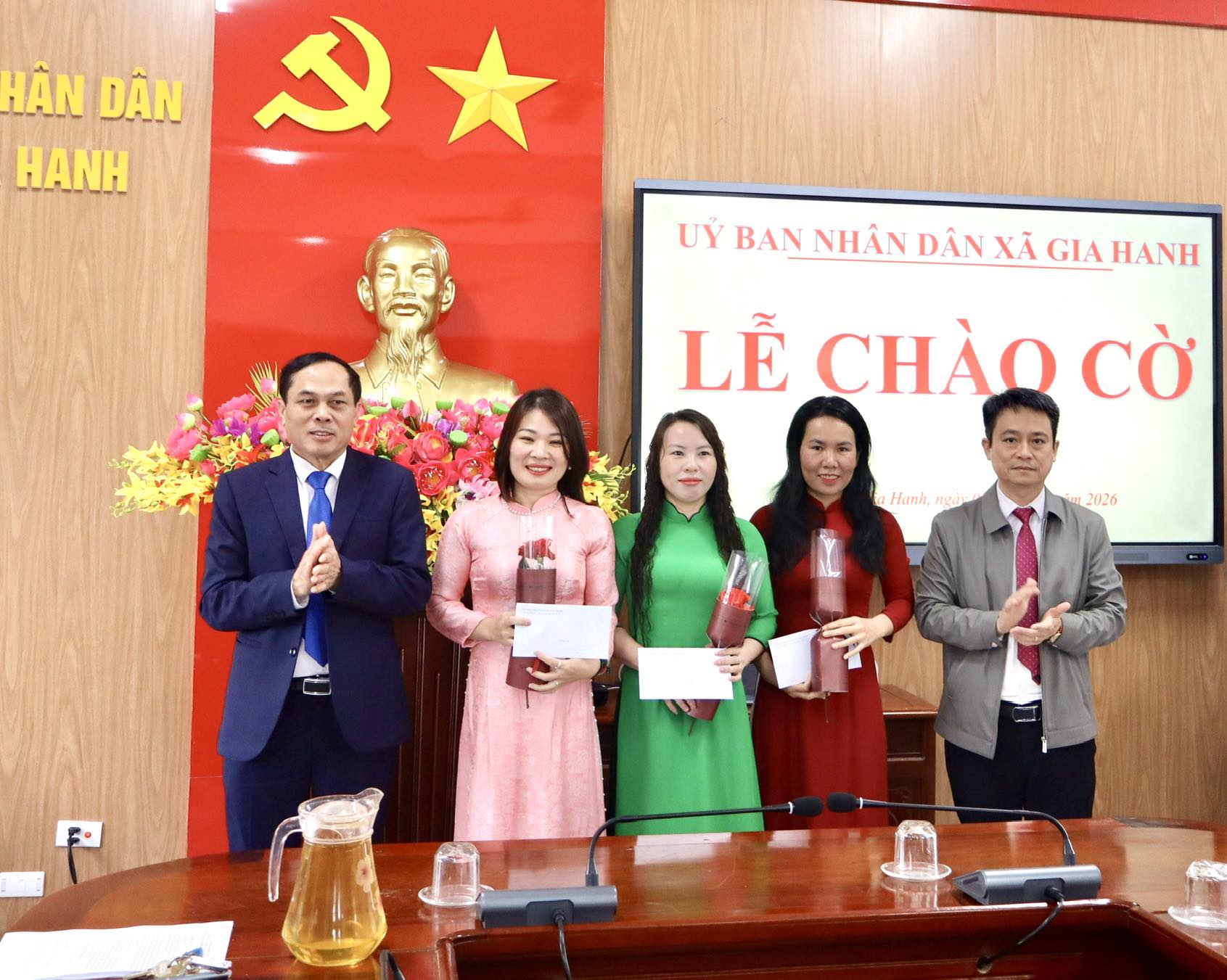 Lãnh đạo UBND xã Gia Hanh tặng hoa chúc mừng các đồng chí có ngày sinh trong tháng 1.